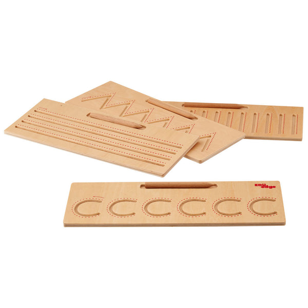 Educational toy to practice writing patterns : Each box contains 4?plates with carved basic patterns and 4 dummy pencils to trace over.